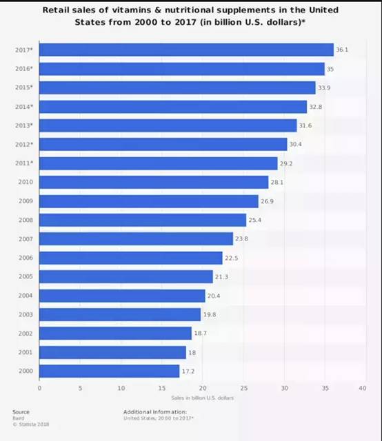 美國維生素補(bǔ)充劑市場連年成長,已是規(guī)模上百億美元的生意。(圖片來源:Statista)